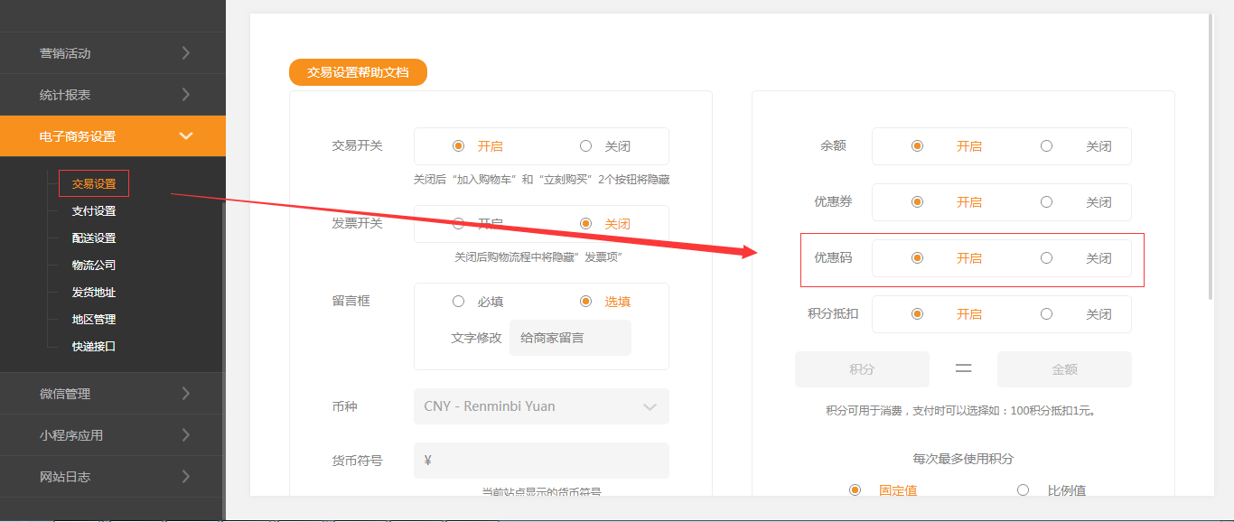 交易设置中能设置 交易开关和 币种及货币符号、积分抵扣、 库存计数、消费密码交易开关, 对营销版用户在此设置交易功能控制.1.依次点击后台管理-电子商务设置-》交易开关 1,交易开关,关闭后“加入购物车”和“立刻购买”2个按钮会隐藏显示。 2、当发票开关开启,需要开具发票的订单,系统将根据设置的税率计算税金,由买家承担。(税率计算不含运费) 3、积分可以用来消费,订单支付的时候用户可以选择使用积分...
